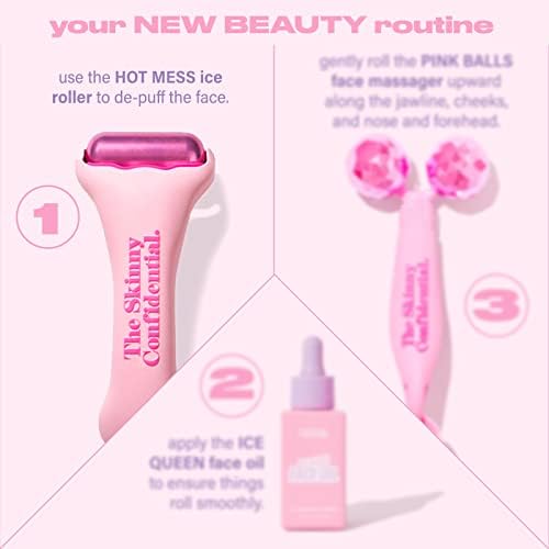 COMPLETE YOUR ROUTINE – Always use the HOT MESS ice roller first to de-puff and soothe the face. Then apply ICE QUEEN face oil to ensure things roll smoothly. Next, gently roll the PINK BALLS face massager upwards along the jawline, cheeks, nose and forehead.area.