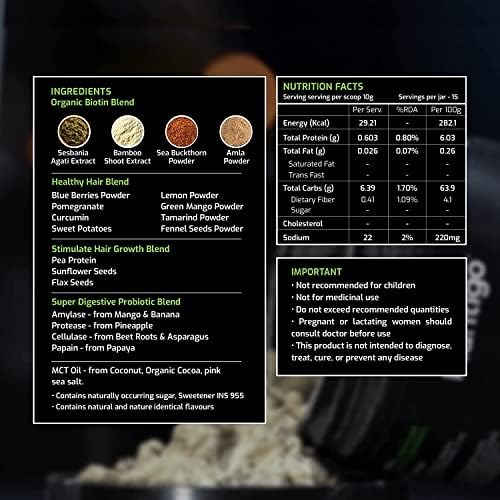 QUALITY ASSURED: We start with what goes IN our products; whole food ingredients and rigorous standards because we believe in truly clean products you can trust. Contains No Soy, No Added Sugar, No artificial flavors and No Trans fats.; Package Content: Pack of 1 Biotin Powder. Item Weight: 150 gm