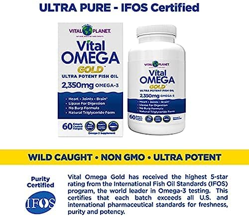 Vital Omega Gold Ultra Potent softgels are provided in their natural triglyceride form for superior absorption, and have a “No Burp Formula” for no fishy aftertaste, or “fish-burps.” Vital Omega has received the highest 5-Star rating from the International Fish Oil Standards (IFOS) program, the world leader in 3rd party Omega-3 testing. This certifies that each batch exceeds all U.S. and international pharmaceutical standards for freshness, purity, and potency.