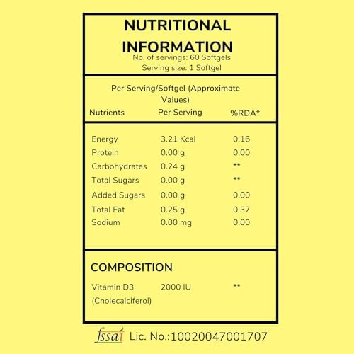 Better absorption Our vitamin D3 supplement is formulated with sunflower oil. This oil is rich in healthy fats that help improve the absorption of vitamin D3, ensuring that your body gets the maximum benefits from the supplement. Cholecalciferol Highest Bioavailable Form of Vitamin D: Our supplement contains cholecalciferol, the most effective and bioavailable form of vitamin D. This form is readily absorbed by the body and converted into its active form, providing quick results. Bone and Muscle weakness Each capsule of our vitamin D3 supplement provides 2000 IU of vitamin D3. This dosage is ideal for supporting bone and muscle strength, reducing the risk of fractures and falls, and promoting overall health.Vitamin D3 helps the body absorb calcium and phosphorus, which are essential for building and maintaining strong bones. It can reduce the risk of fractures and falls, especially in older adults. Vitamin D3 also plays a role in regulating bone mineralization and preventing bone loss. muscleEnhances Muscle Function Vitamin D3 is important for muscle function and strength, as it helps regulate calcium levels in the muscle cells. It can improve muscle performance and reduce the risk of muscle weakness and atrophy. Low levels of vitamin D3 have been linked to muscle pain, weakness, and fatigue.