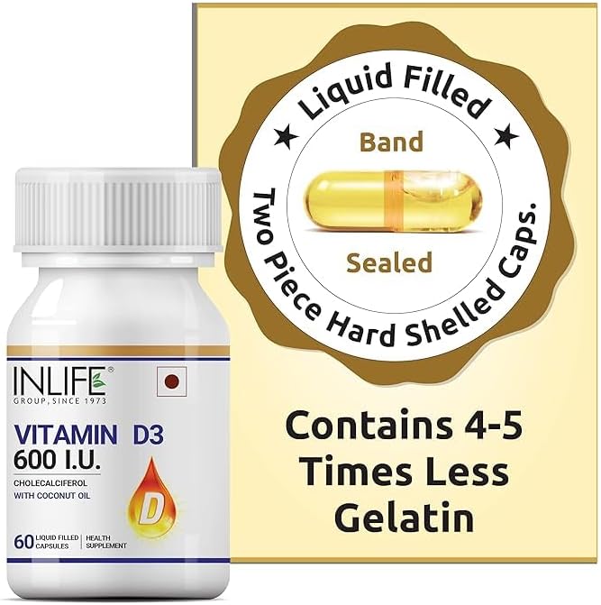 Vitamin D3 600 IU Cholecalciferol Supplement with Coconut Oil for Better Absorption, For Men & Women, Immunity, Bone Health, Muscles – 60 Liquid Filled Capsules (Pack of 1, 60) . Active form and high absorption. Cholecalciferol is the active form of Vitamin D3, so it provides superior absorption compared to regular Vitamin D3. When taken directly in this format it works more quickly and can be delivered in lower concentrations. Vitamin D3 in liquid filled hard shell capsule form is easy to swallow and convenient to take. Some research indicates that vitamin D3 in liquid filled capsule form is more highly bioavailable than powdered or tablet forms. Activates the immune system. In general, vitamin D3 functions to activate the immune systems, improve immunity and increase circulation. Vitamin D3 helps enhance calcium absorption by regulating concentrations of calcium and phosphorus in the body to provide essential support for bones and teeth. Vitamin D3 (termed the ‘sunshine vitamin’) is the same biologically active form of Vitamin D you get from the sun’s UVB rays. With this complex, you’ll get the benefits without the burn. At Healthcare, we take pride in providing just the right number of high-quality ingredients for maximum results – no more, no less. Just one small, easy-to-swallow liquid filled hard shell capsule per day provides 600 IU of D3, helping you support strong bones and healthy immune system. Our Vitamin D3 is encapsulated in liquid filled hard shell capsules that are having many advantages over soft gels. It contains 4-5 times less gelatine, requires no other additives, consists of water and gelatine only, are stable in hot climates thereby do not stick together and become gluey like soft gelatine capsules, will disintegrate faster due to the capsule wall being 5 times thinner than the walls of soft gelatine capsules, less product migration into the shell, less diffusion of odours.