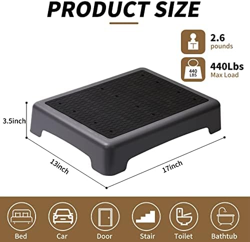 WIDE PLATFORM: 17″L X 13″W X 3.5″HHEAVY DUTY: Hold Up to 440 LBSAnti-Slip: Unique drainage hole design, water will not stay on the surface of the stool to play a non-slip effect