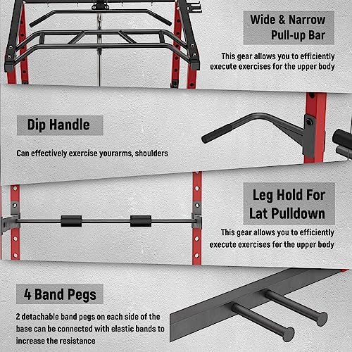 24 FREE ATTACHMENT: The package comes with J-Hooks, Landmine, Dip Bars, T bar, LAT Bar, 4 carabiners, Leg Holder, Safty Arms, Band Pegs, a Hook for barbell storage and 2 extra standard Olympic plate holder, providing a variety of exercises for example Wide & Narrow LAT Pull-down, Landmine Movements, Seated cable row, Bench press, Squat, Dead-lifts, Bicep Curl, Triceps Extensions, Pull-ups, Chin-ups, Dips and more.
